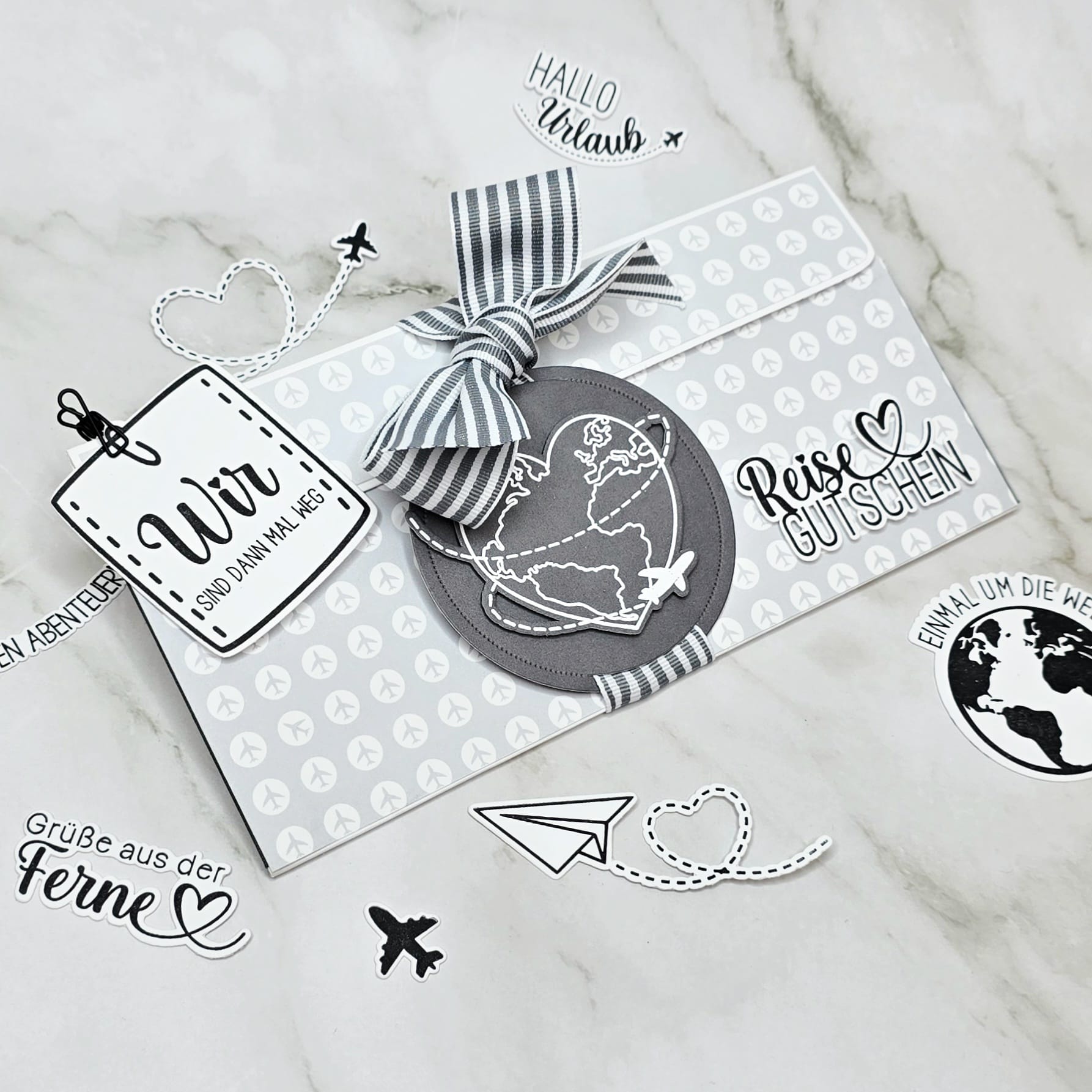 Ein hochwertiges Photopolymer-Stempelset mit 11 traumhaften Stempeln auf einem A5 Sheet – ideal für alle, die vom Fernweh gepackt werden! 🧳✈️📮