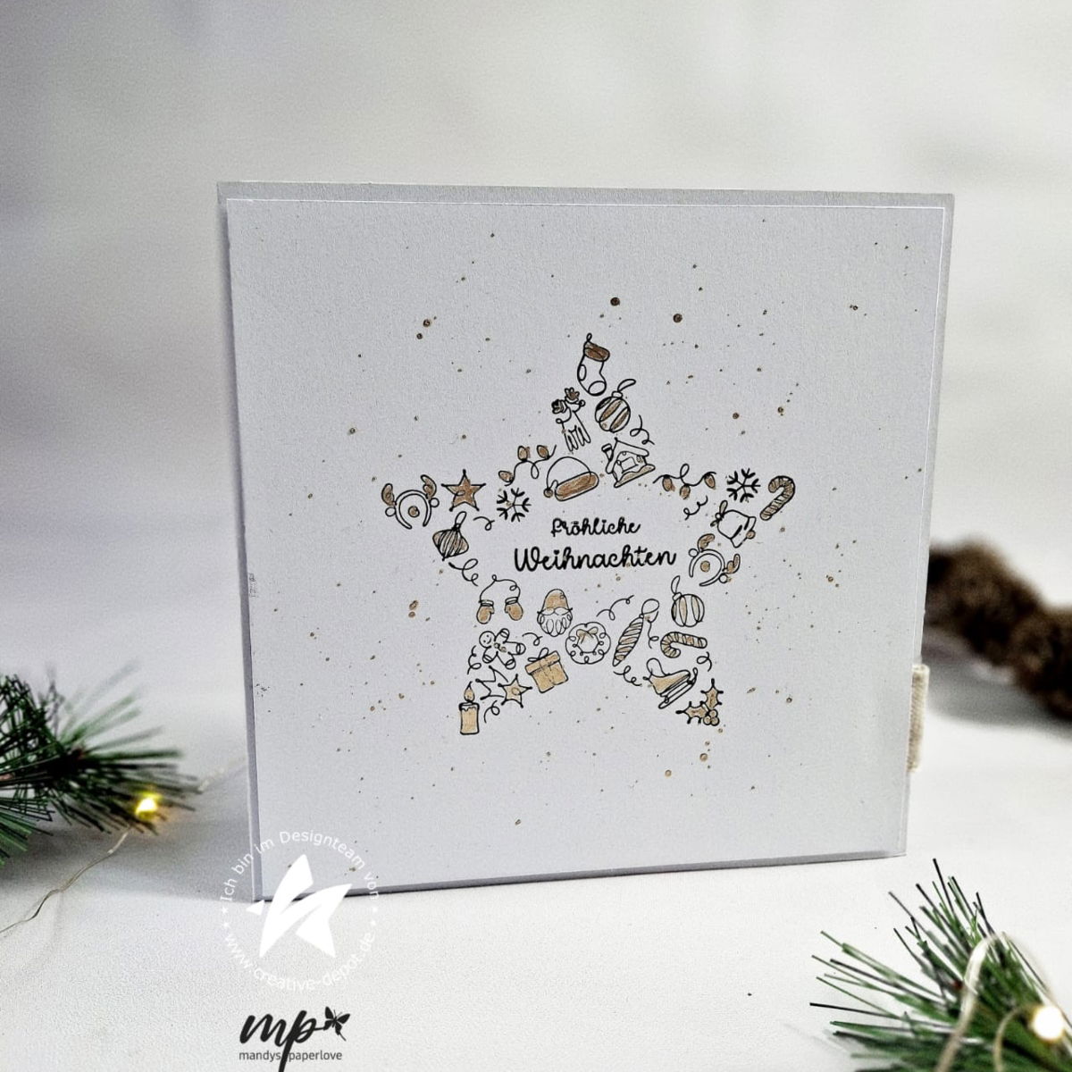 Ein großer, aus vielen kleinen Weihnachts-Icons gestalteter Stern bildet das Herzstück des Sets ⭐ – liebevoll arrangiert aus festlichen Symbolen wie 🎁 Geschenken, 🎅 Weihnachtsmützen, 🍬 Zuckerstangen, ❄️ Schneeflocken, 🕯️ Kerzen und 🎀 Christbaumkugeln. Die filigrane Linienführung sorgt für elegante und saubere Stempelabdrücke – ideal für deine festlichen Bastelideen.