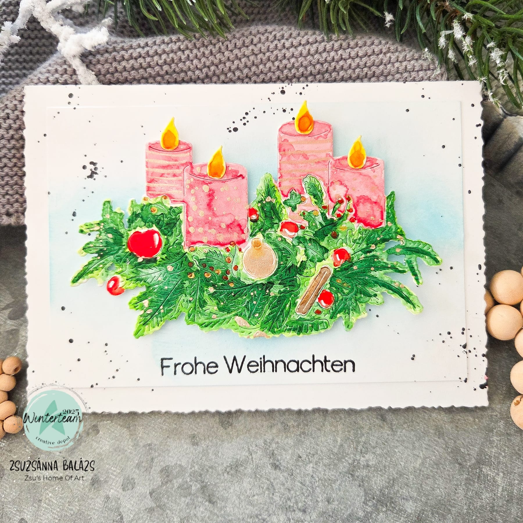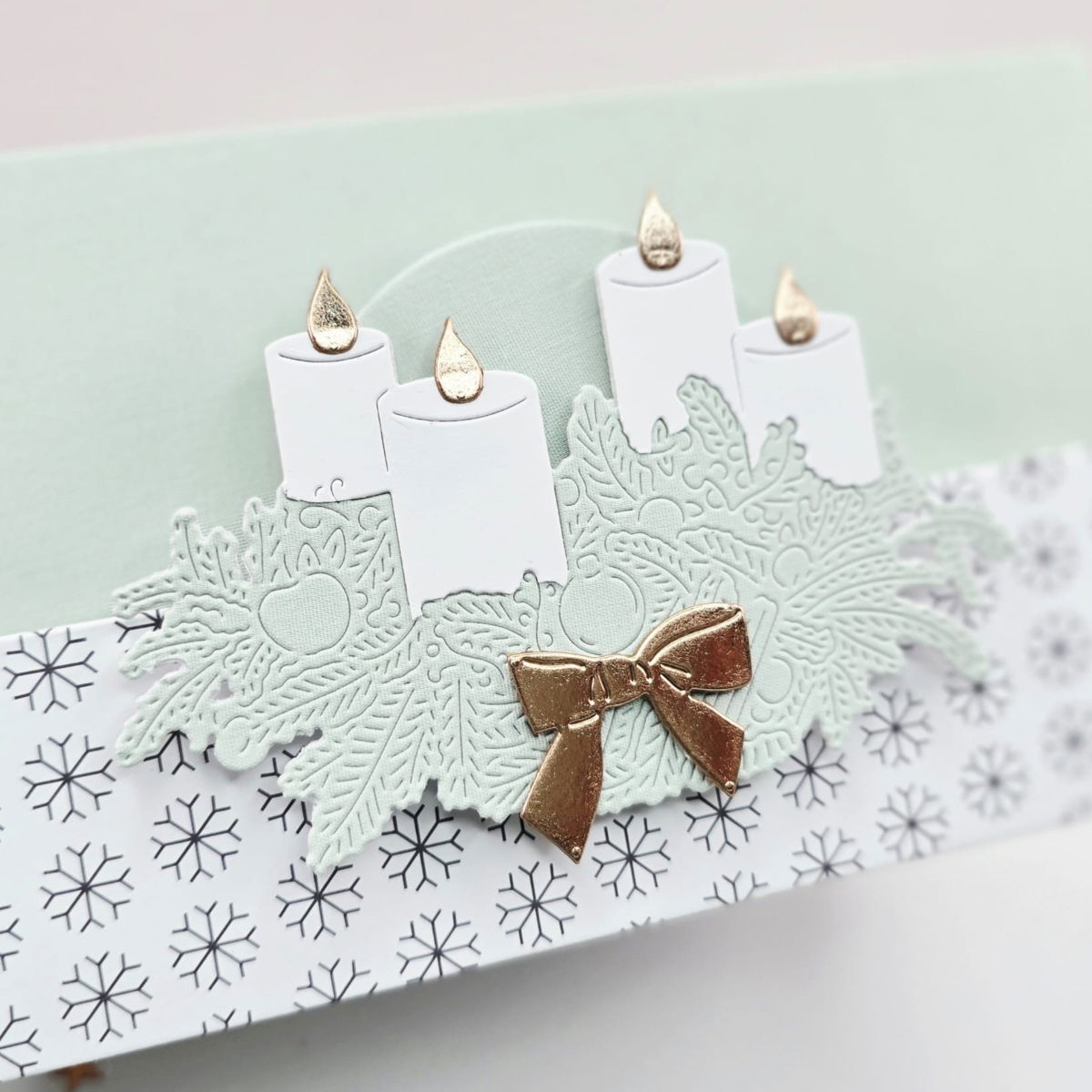 Die Stanzform enthält detaillierte Kranz-Elemente mit Tannenzweigen, Beeren, Kerzen 🕯️ und einer hübschen Schleife 🎀 – perfekt, um auf deinen Projekten den typischen Adventszauber zu entfalten.