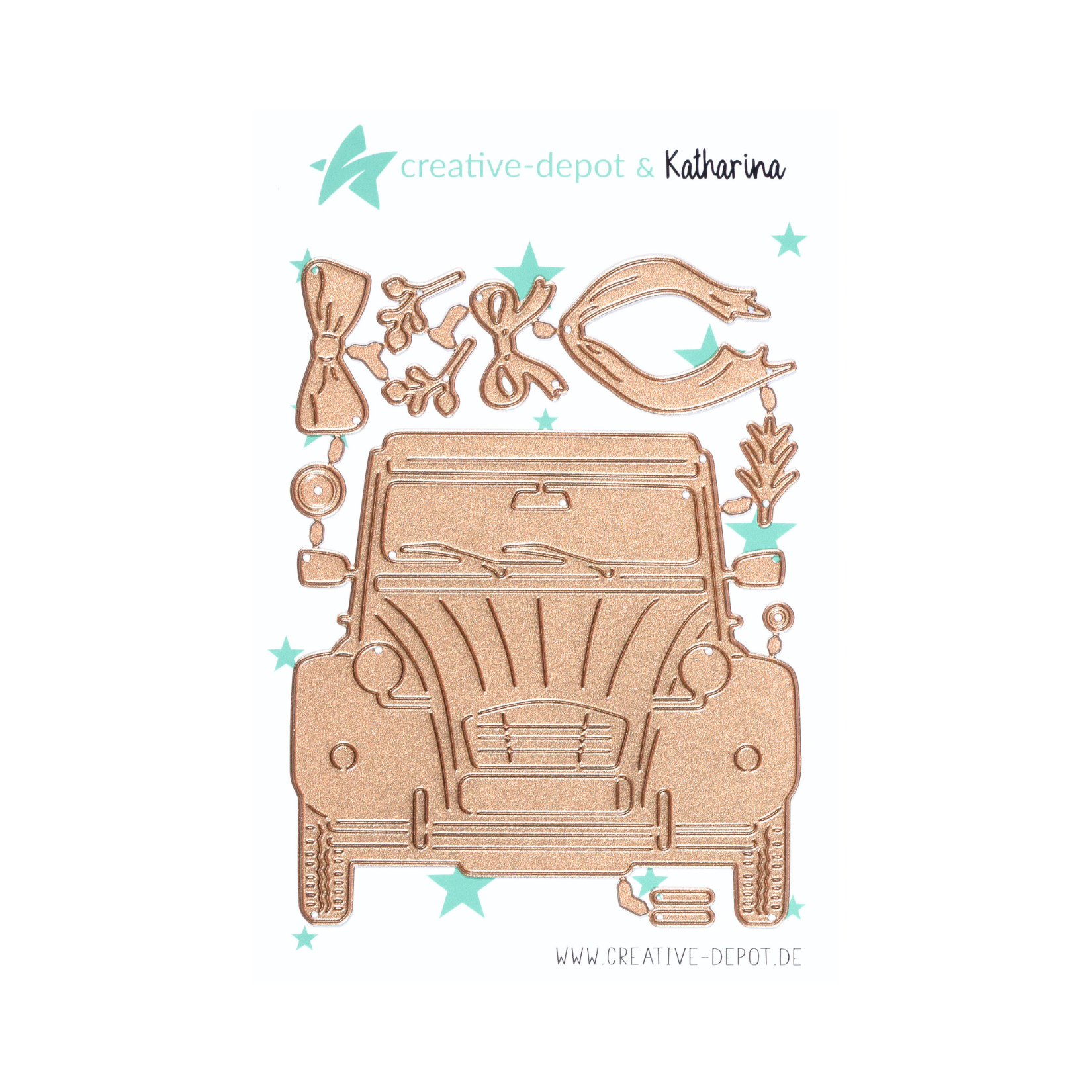 Mach aus dem Weihnachtsauto – Frontal das perfekte Hochzeitsauto! Mit romantischen Details wie einer Herzgirlande, dekorativen Zweigen und den klassischen Dosen zauberst du im Handumdrehen eine wunderschöne Hochzeitsdekoration für deine Karten, Scrapbooking-Seiten oder Geschenkverpackungen.