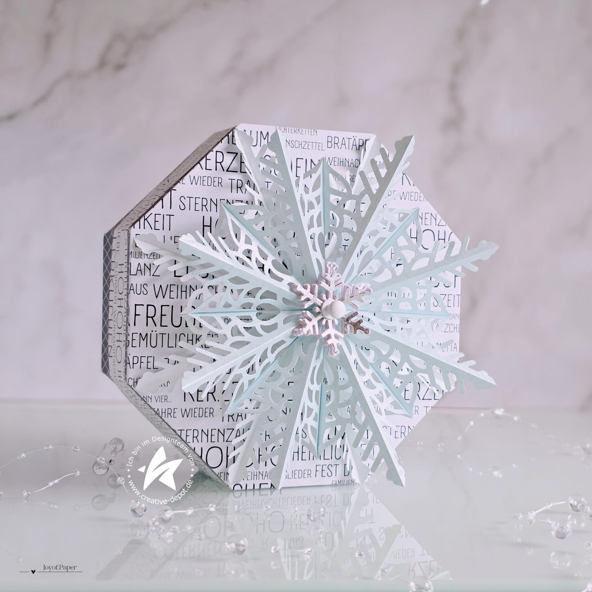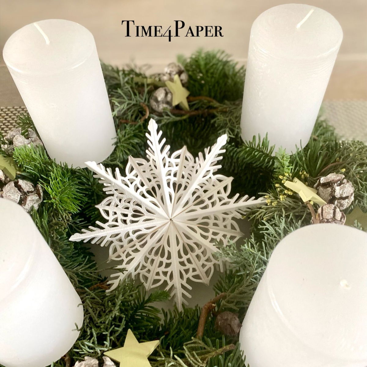 Die Faltschneeflocke 1 besticht durch ihr einzigartiges, gefaltetes Design, das sich nach dem Stanzen und Falten zu einer detailreichen, symmetrischen Schneeflocke entfaltet.