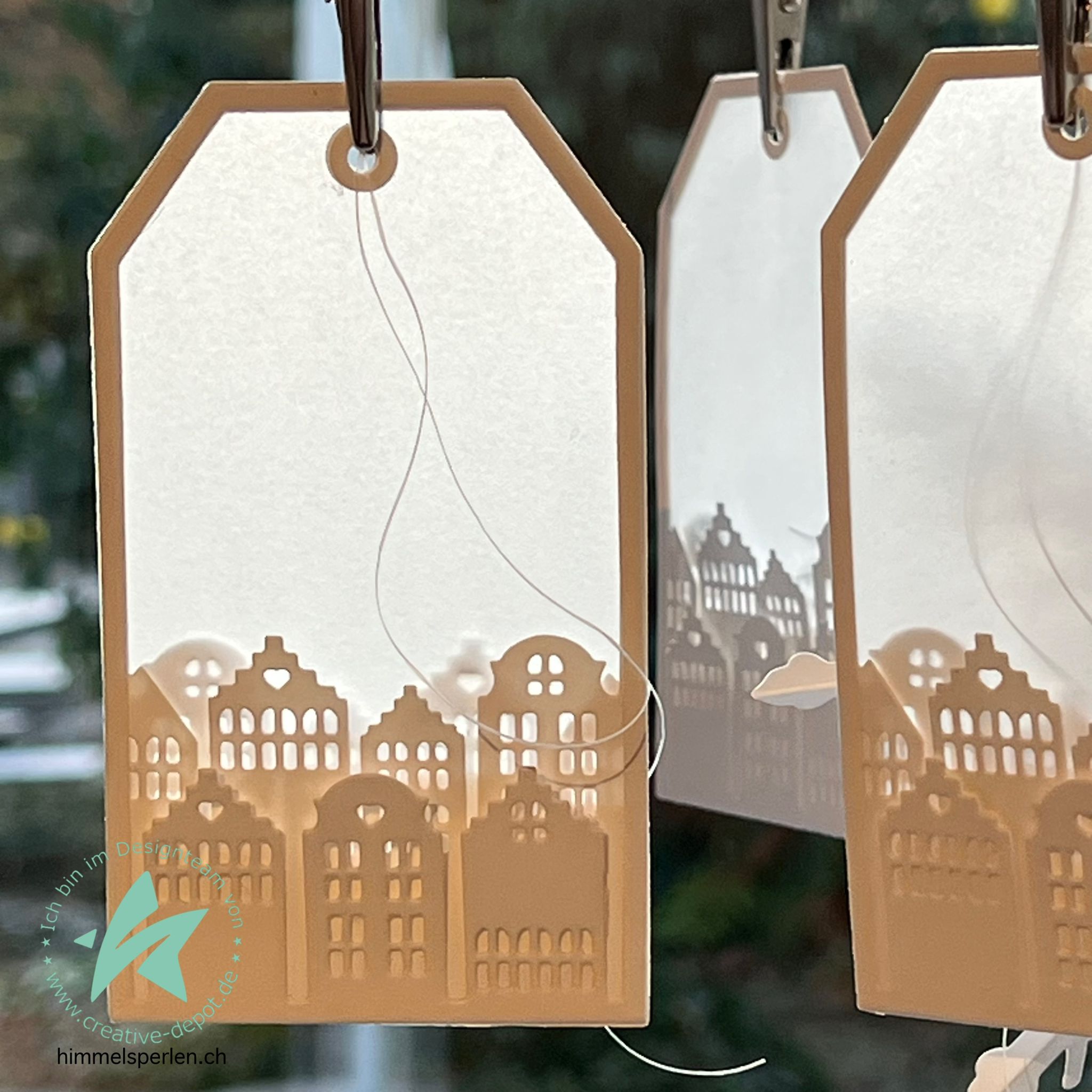 🏘️ Mit der Stanze „Layer Häuser für Standard Anhänger“ zauberst du im Handumdrehen wunderschöne, winterliche und städtische Motive auf deine Geschenkanhänger!