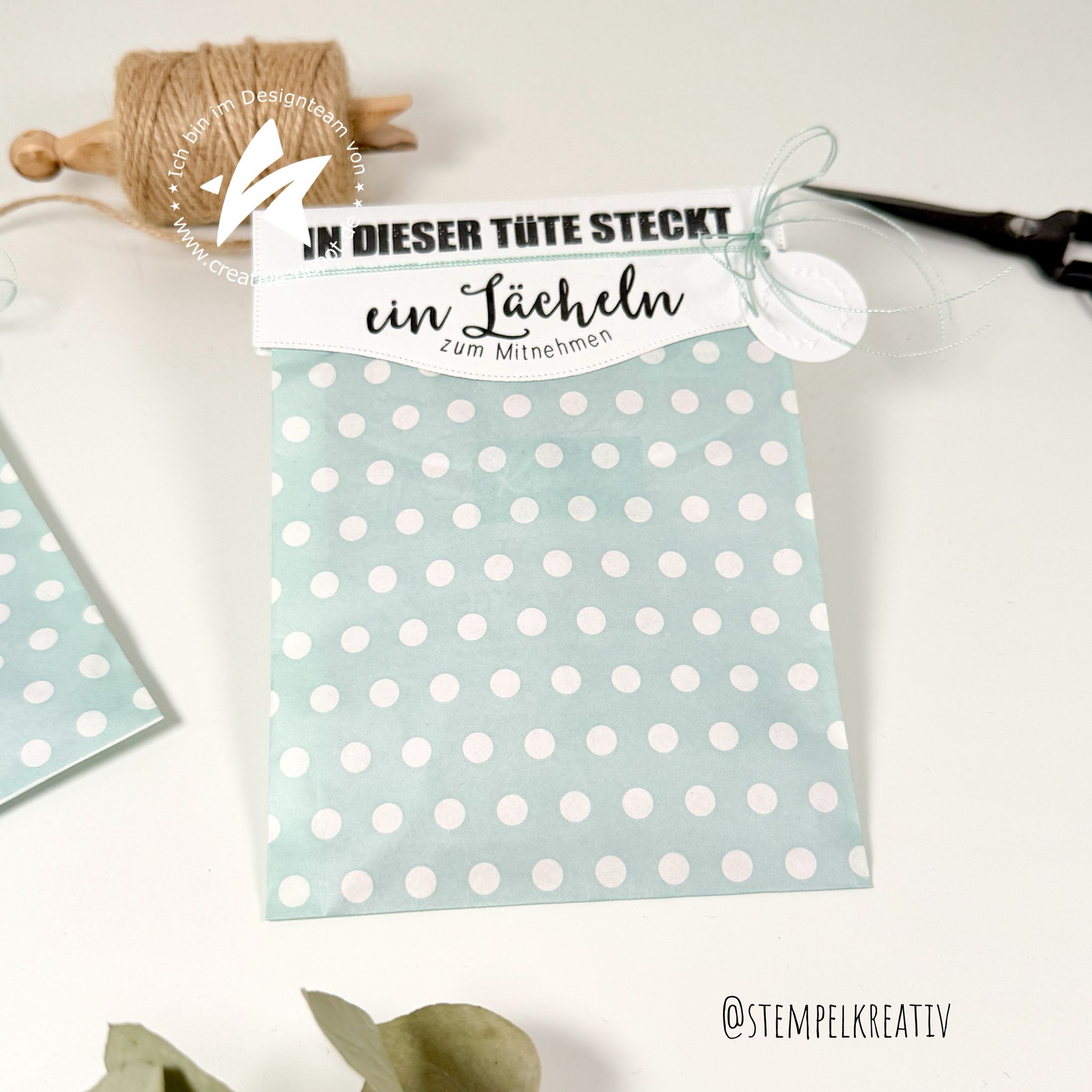 Sie stanzt einen formschönen Topper, der gefaltet über kleine Tüten gelegt wird – ideal für Zellophanbeutel, Kraftpapiertüten und kleine Verpackungen.