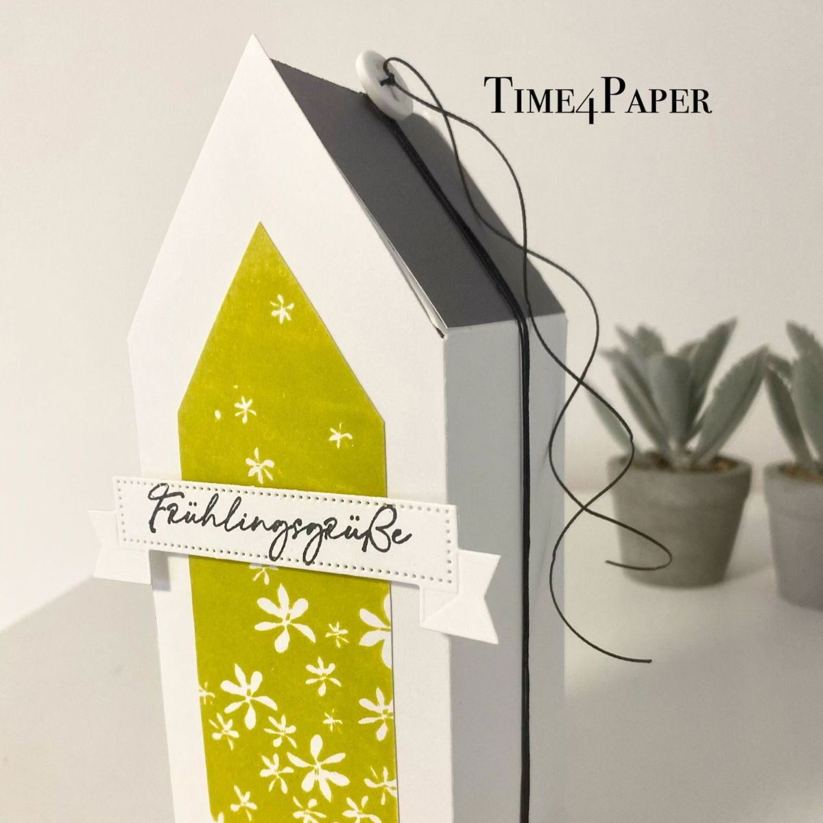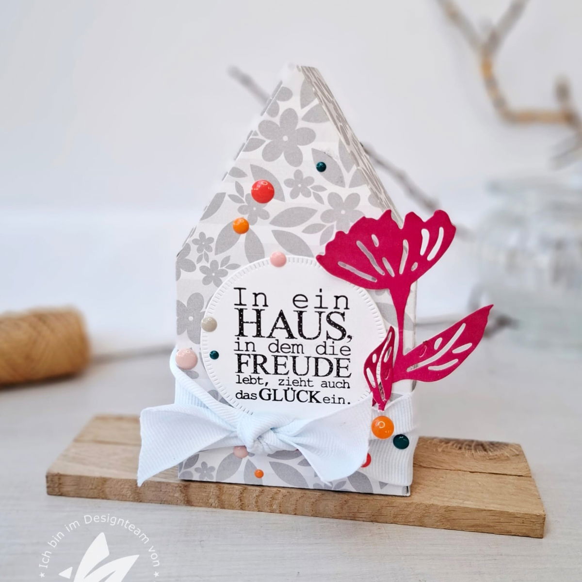 Das hohe Hausmotiv wird von einer Vielzahl zarter Blüten geschmückt und strahlt Ruhe, Hoffnung und Neubeginn aus – perfekt für die Frühlingszeit, aber auch für viele andere Anlässe.