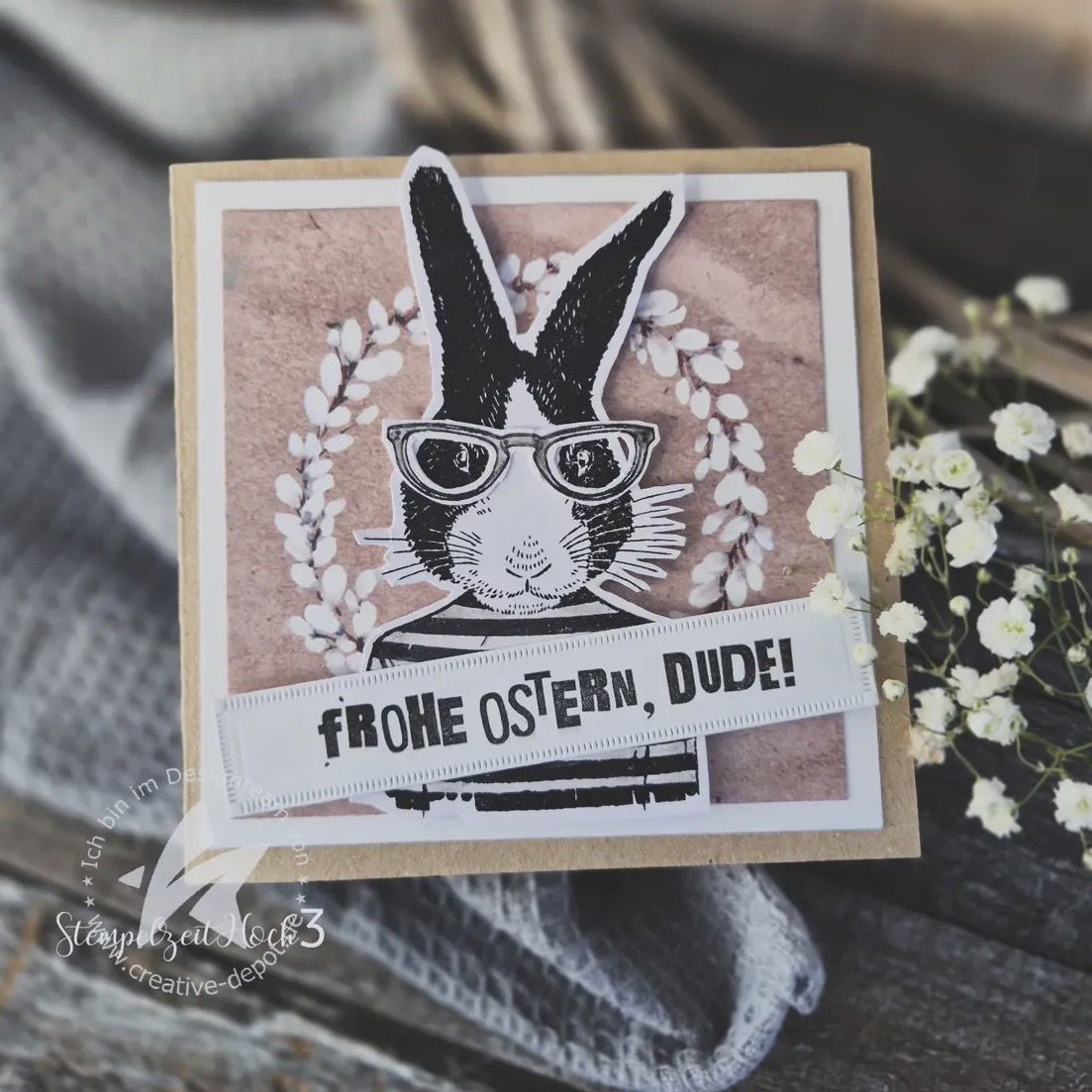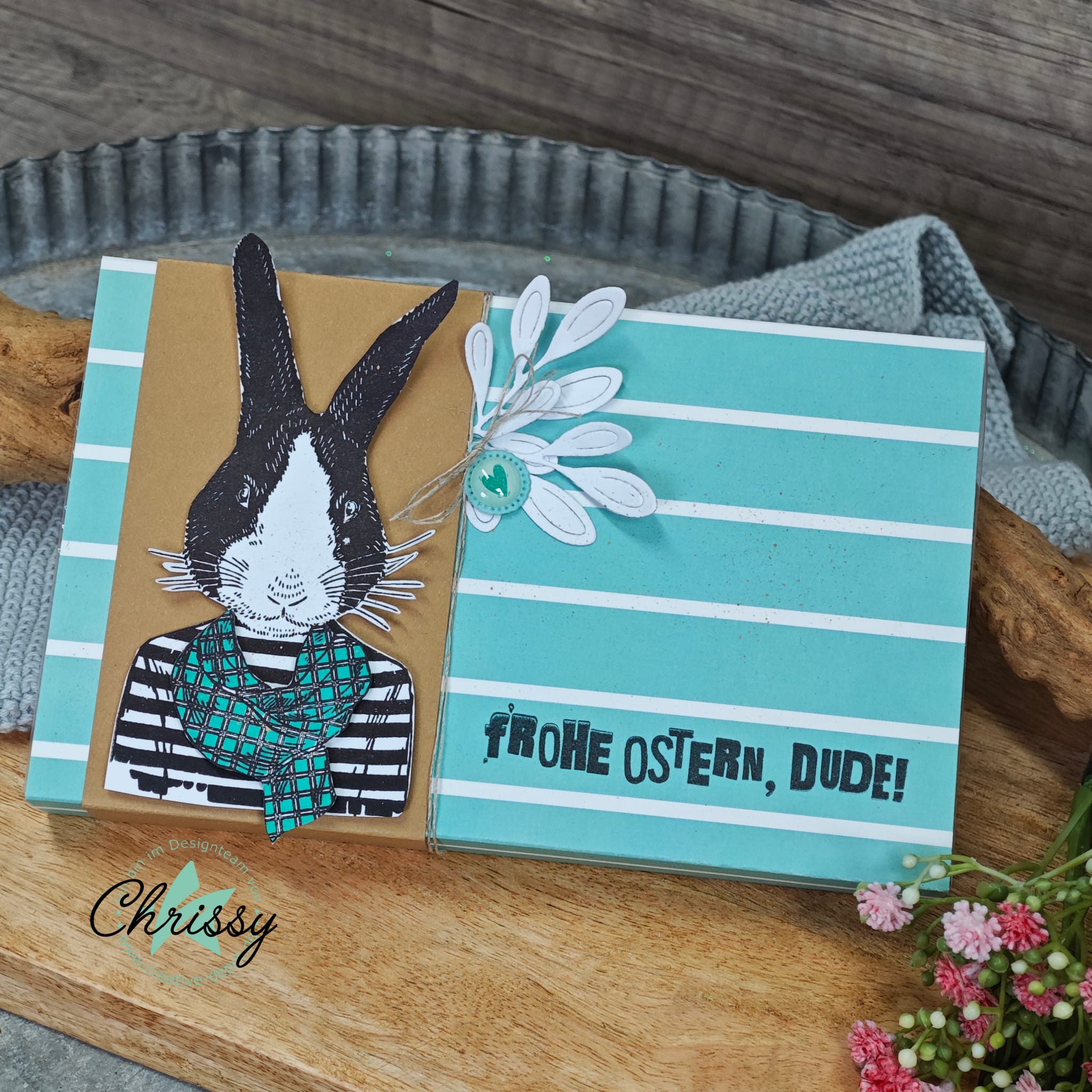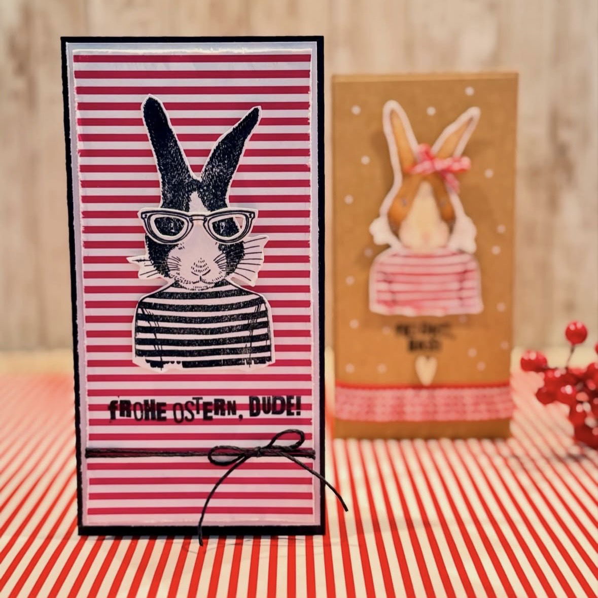 🐇 Der charakterstarke Hase im Ringelshirt, kombiniert mit coolen Accessoires wie Brille 👓 und Tuch 🧣, macht dieses Set zu einem echten Hingucker. Die Schriftzüge wie „Frohe Ostern, Dude!“ oder „Für dich, Hase!“ sorgen für Humor und Persönlichkeit ✨.