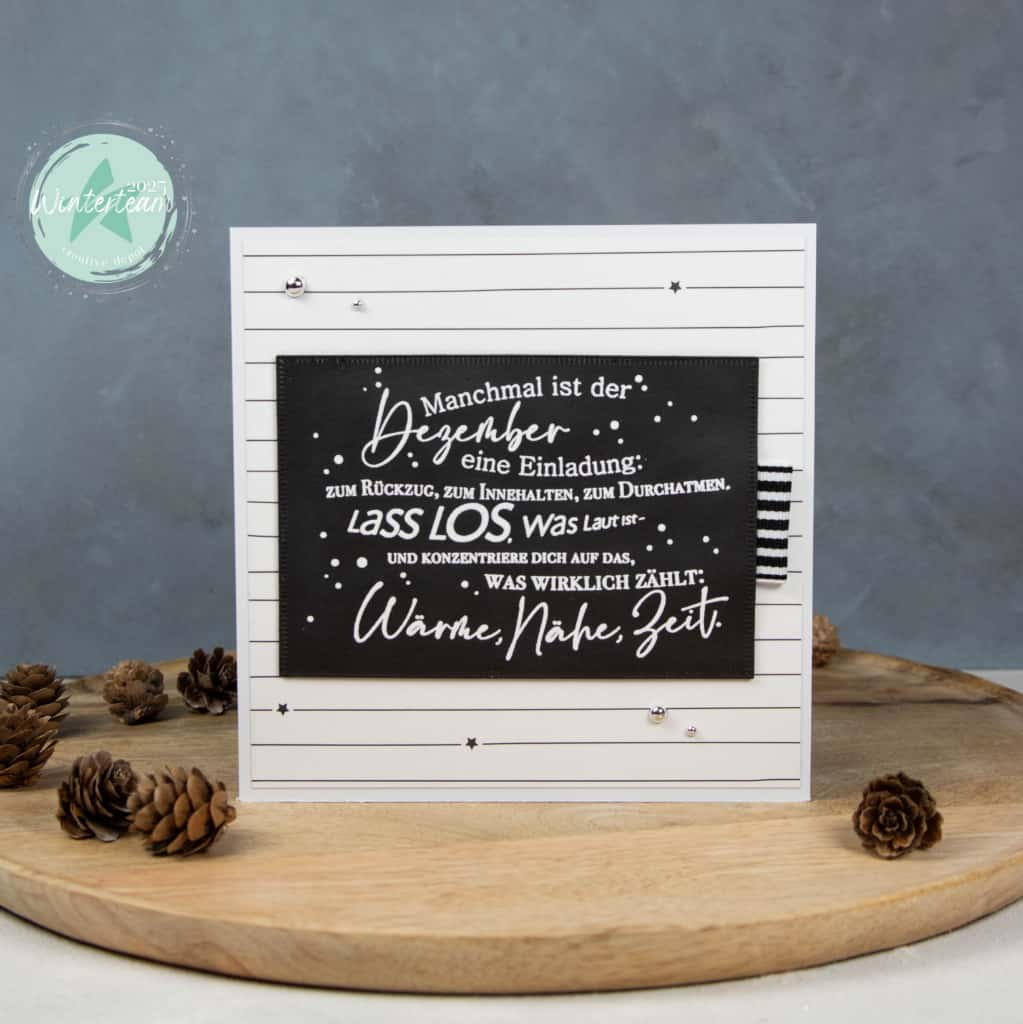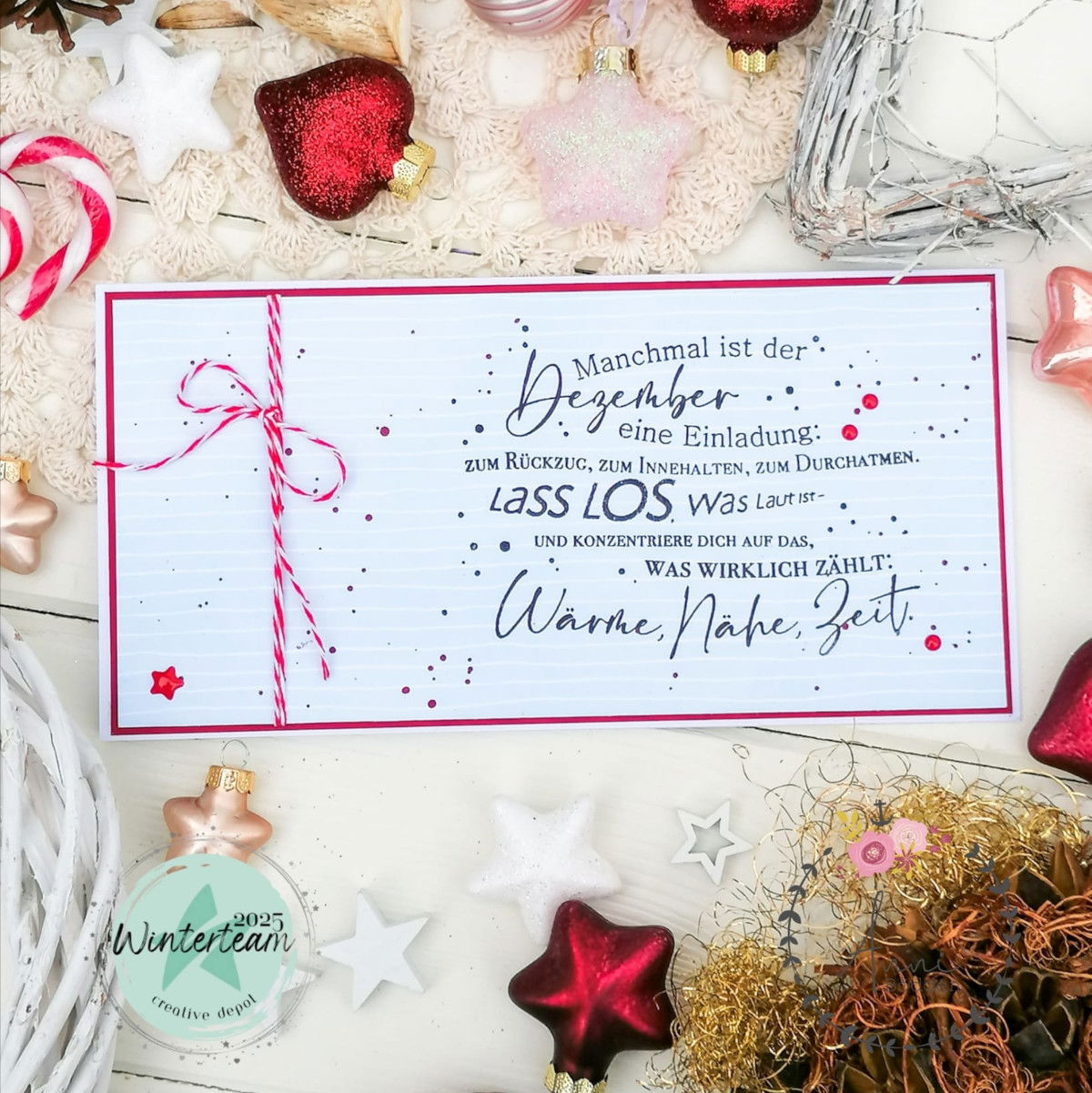 „Manchmal ist der Dezember eine Einladung zum Rückzug, zum Innehalten, zum Durchatmen. Lass los, was laut ist – und konzentriere dich auf das, was wirklich zählt: Wärme, Nähe, Zeit.“ (Größe ca. 11,0 x 7,7 cm) -