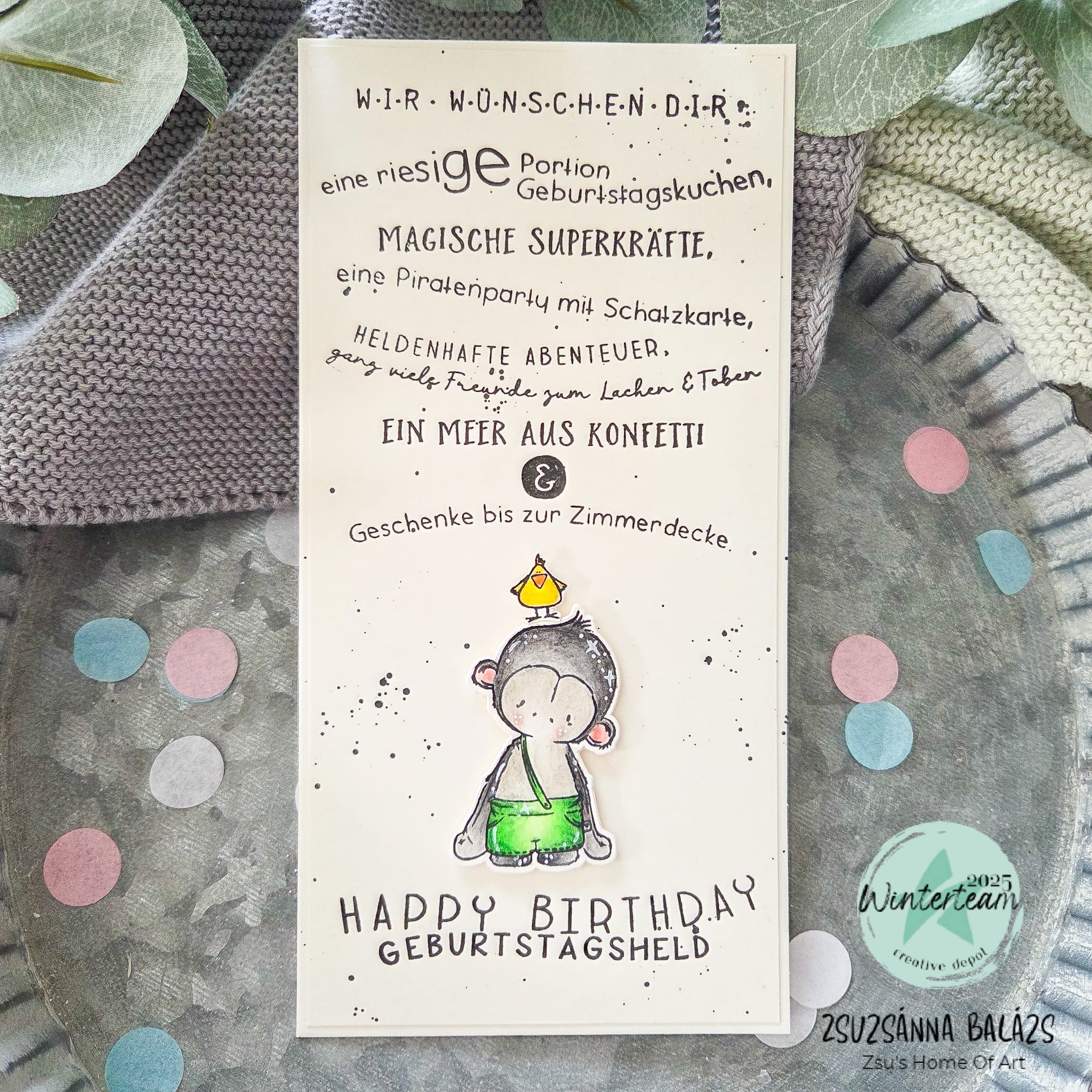 Mit diesem bezaubernden Stempelset zieht pure Lebensfreude in deine Bastelprojekte ein! Das niedliche Äffchen mit seinem verschmitzten Blick sorgt für gute Laune – egal ob auf Karten, Geschenken oder im Kinderzimmer-DIY. In Kombination mit den humorvollen Sprüchen und kleinen Party-Elementen entstehen im Handumdrehen ganz besondere Kreationen.