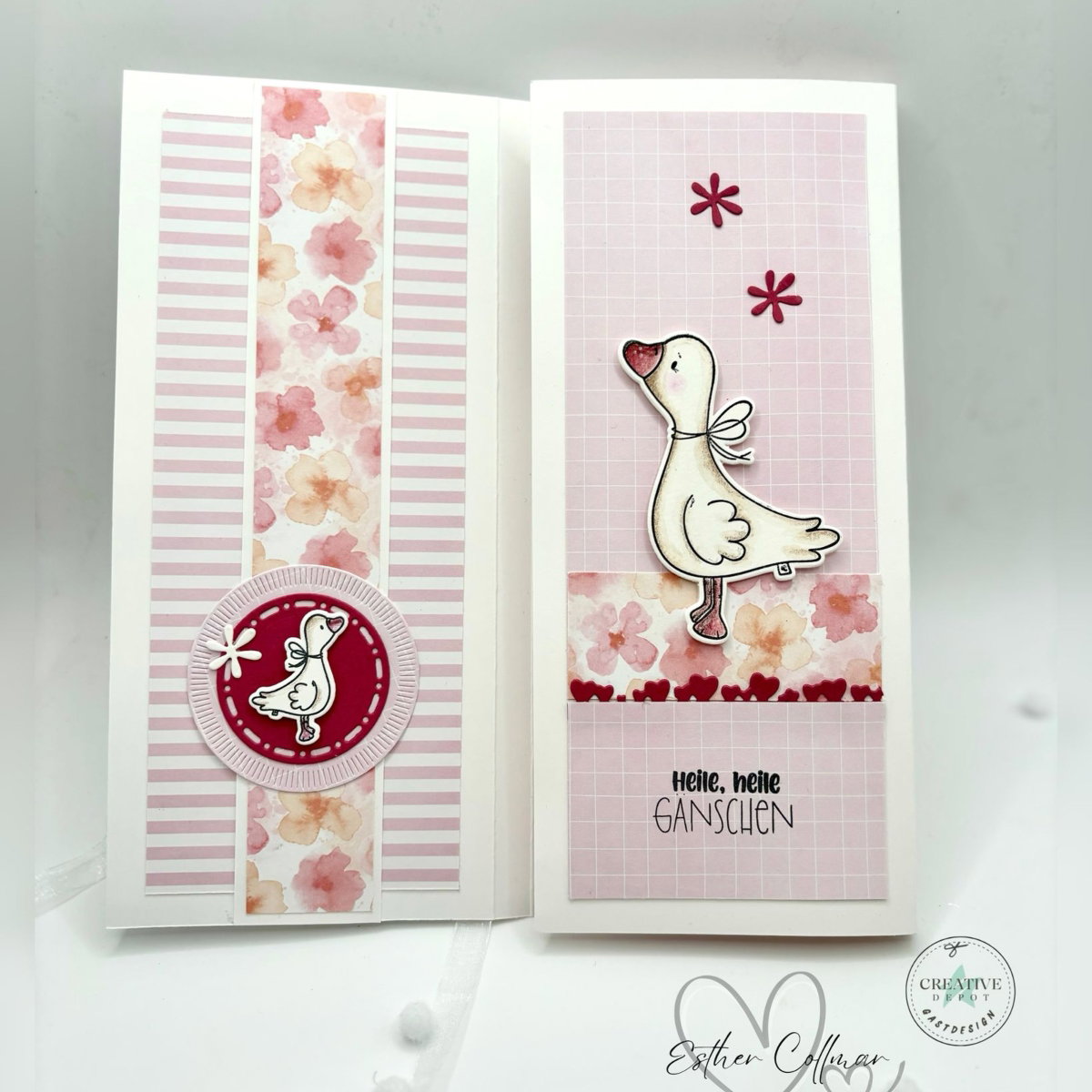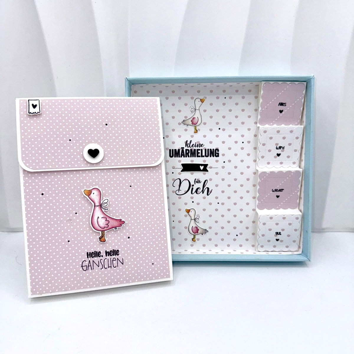 Die niedlichen Gänsemotive – groß und klein – werden ergänzt durch passende Schriftzüge wie „Heile, heile Gänschen“, „Alles wird wieder gut“ und „Handmade“. Perfekt für Trostkarten, kleine Aufmerksamkeiten oder einfach, um jemandem ein Lächeln ins Gesicht zu zaubern.