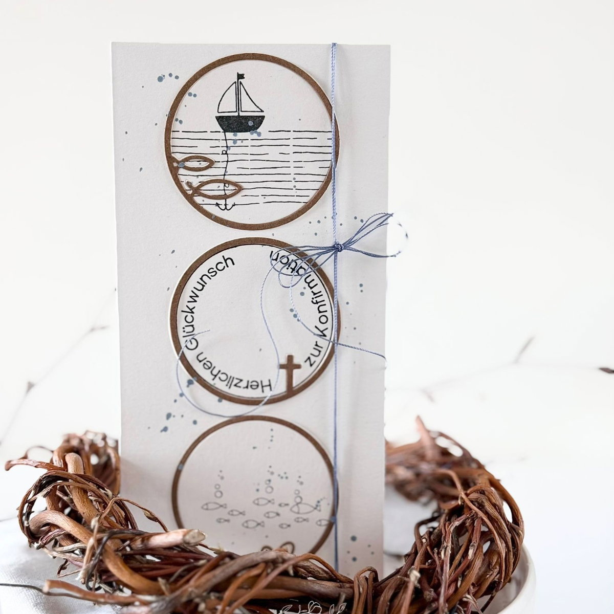 Mit dem liebevoll gestalteten Stempelset „Komm, feier mit mir“ begleitest du besondere Lebensfeste stilvoll und modern. Ob Taufe, Kommunion, Konfirmation oder Jugendweihe – dieses Set vereint klare Typografie mit zarten Symbolen zu zeitlosen Kreis-Motiven, die sich wunderbar kombinieren lassen.