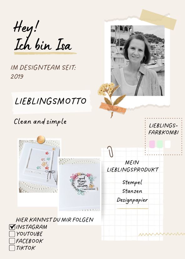 Auf ihrem Instagram-Profil zeigt sie regelmäßig inspirierende Ideen für Karten, Layouts, Minialben und vieles mehr – mit Liebe zum Detail, raffinierten Techniken und sogar Nadel und Faden im Einsatz.