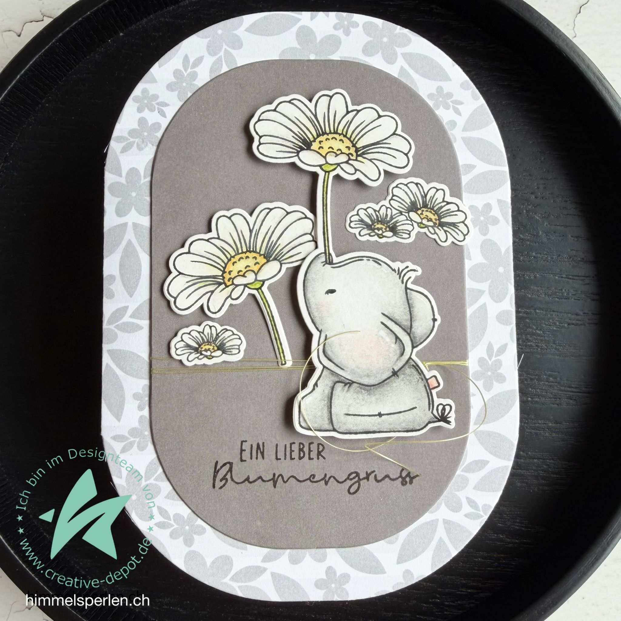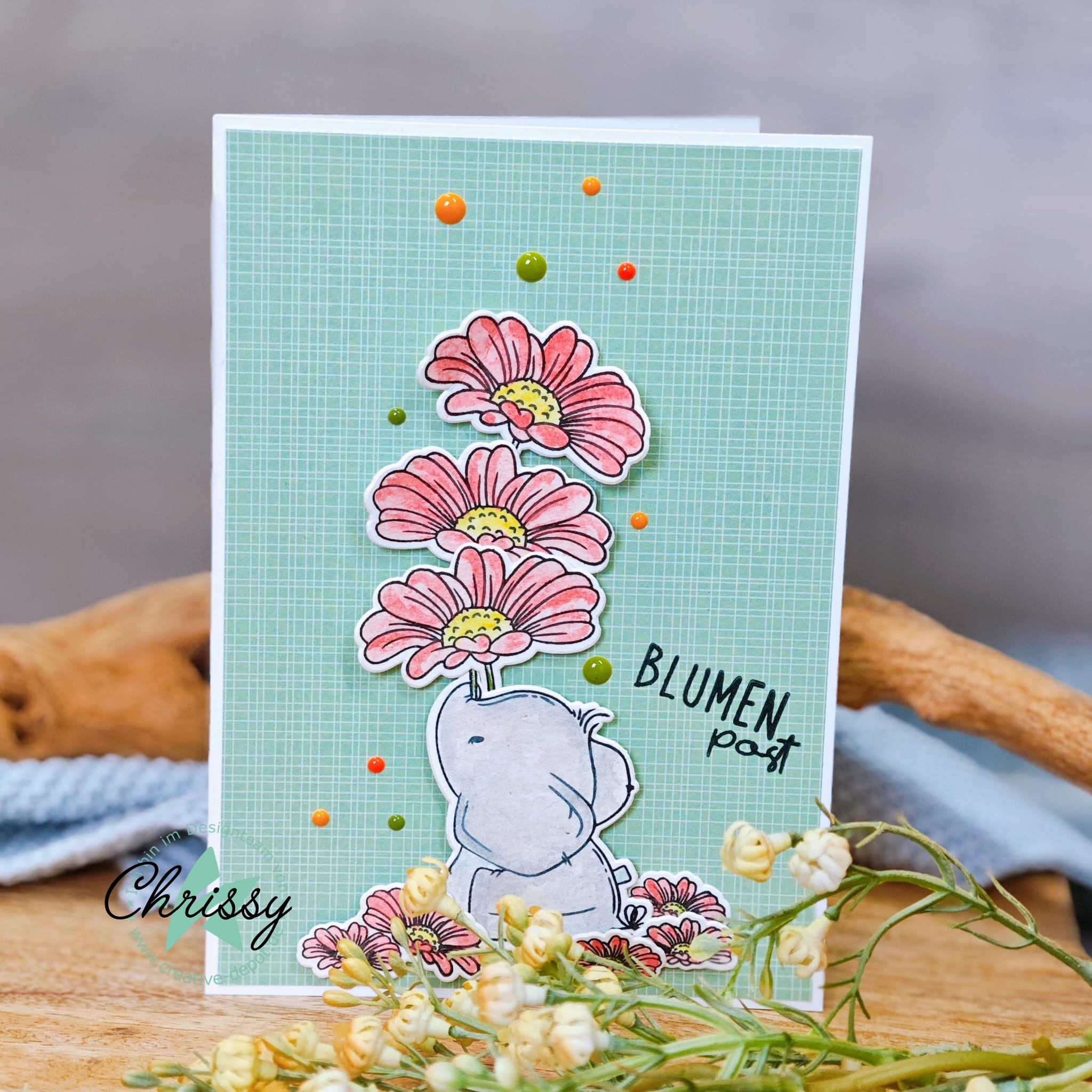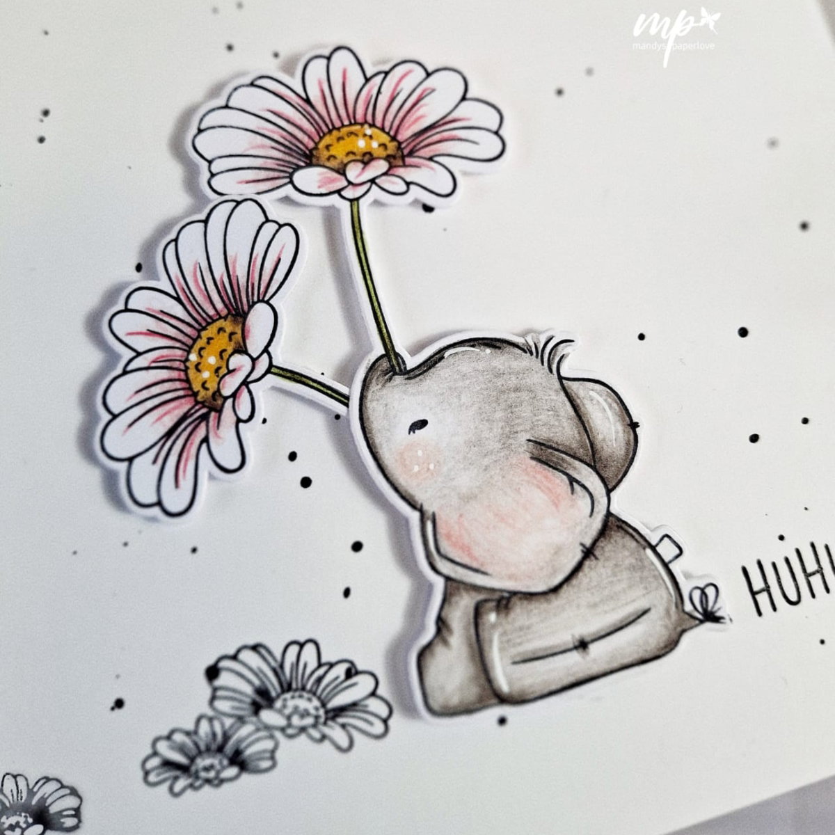 Die zarten Gänseblümchen, der niedliche Elefant und die handgeschrieben wirkenden Texte verleihen Karten, Geschenkverpackungen und kreativer Post einen besonders fröhlichen Charakter.