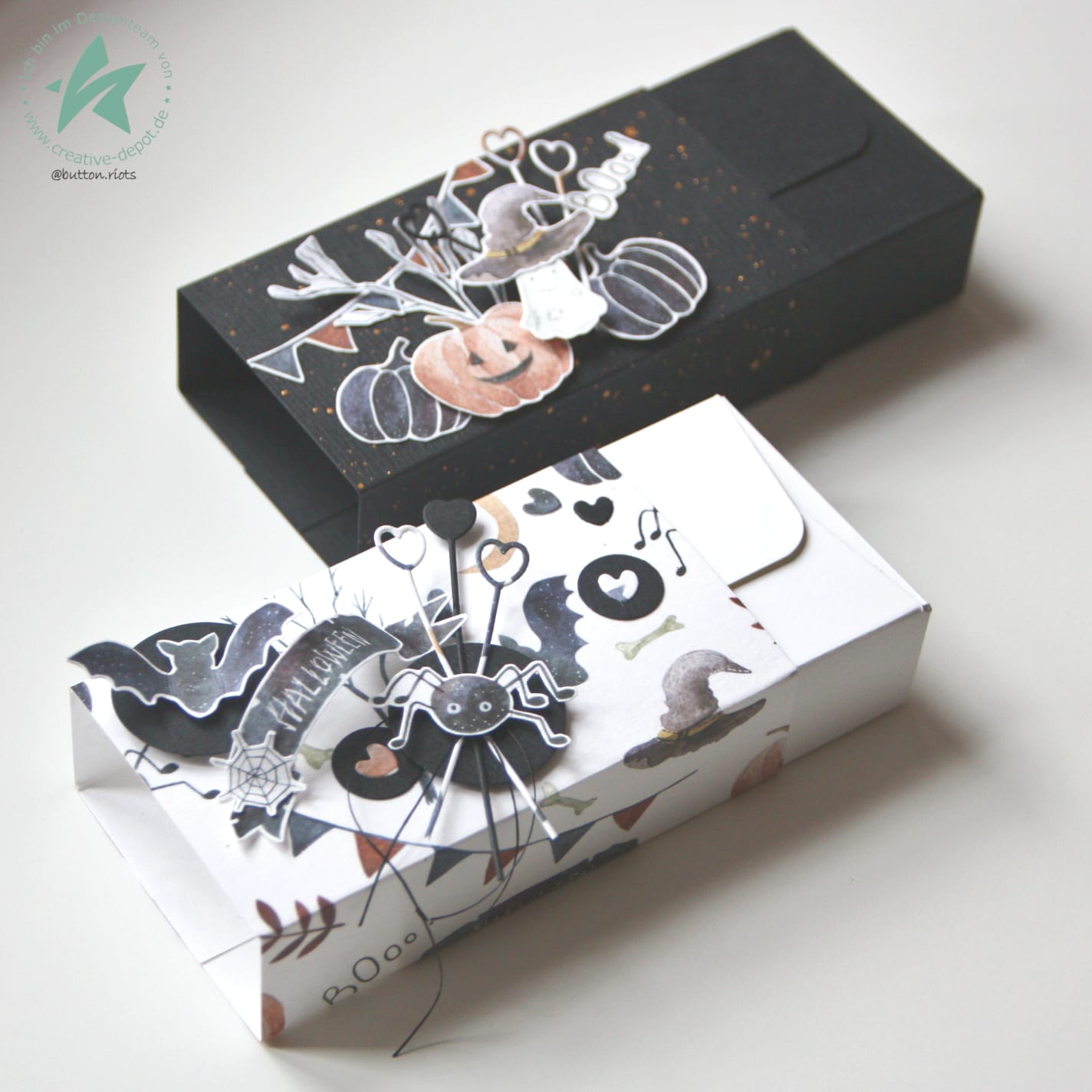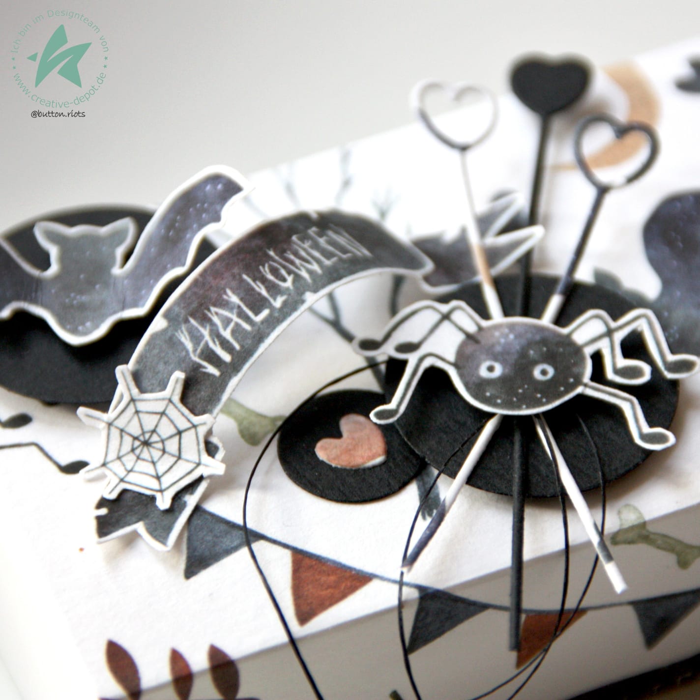 In jeden gut sortierten Bastelfundus gehört natürlich auch Papier, mit welchem sich schaurig schöne Halloween-Projekte gestalten lassen. Auf diesem Designpapier tummeln sich Kürbisse, Spinnen, Hexenhüte und andere thematisch passende Motive. Lasst eurer Fantasie freien Lauf. Unser Designteam liefert euch in den Beispielen erste Anregungen.