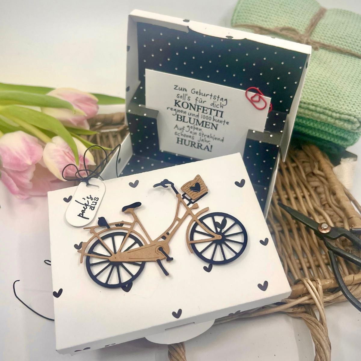 Mit der Stanze „Fahrrad mit Körbchen“ bringst du Bewegung und Lebensfreude auf deine Bastelprojekte!