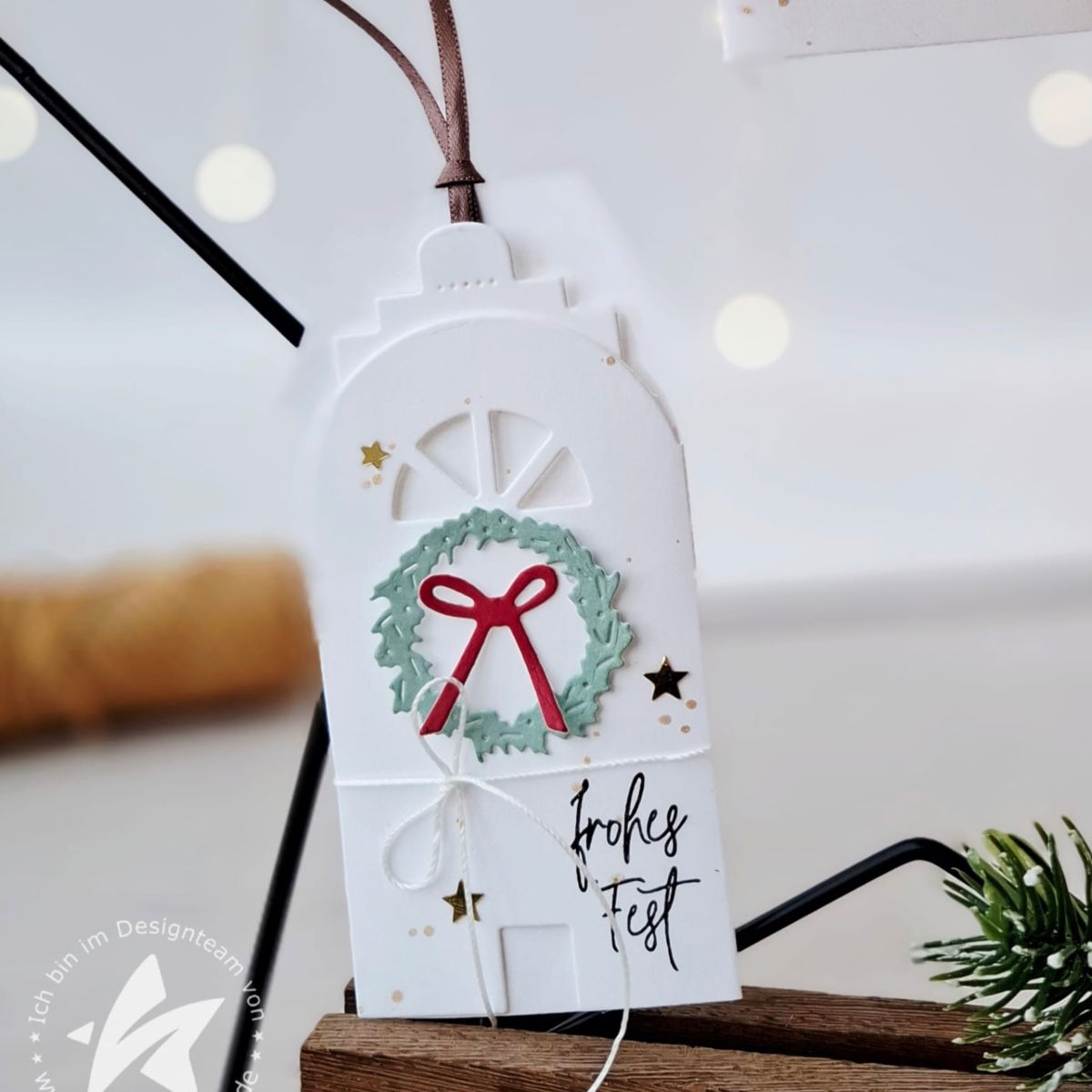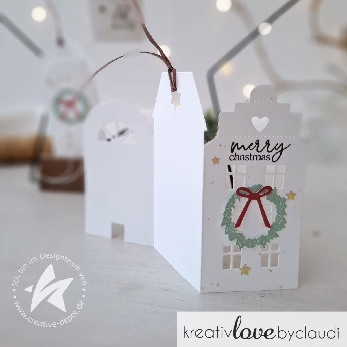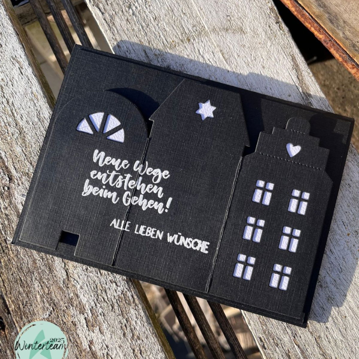 Das Stanzset enthält alle Elemente, um eine aufklappbare Karte mit Häusermotiv zu gestalten: