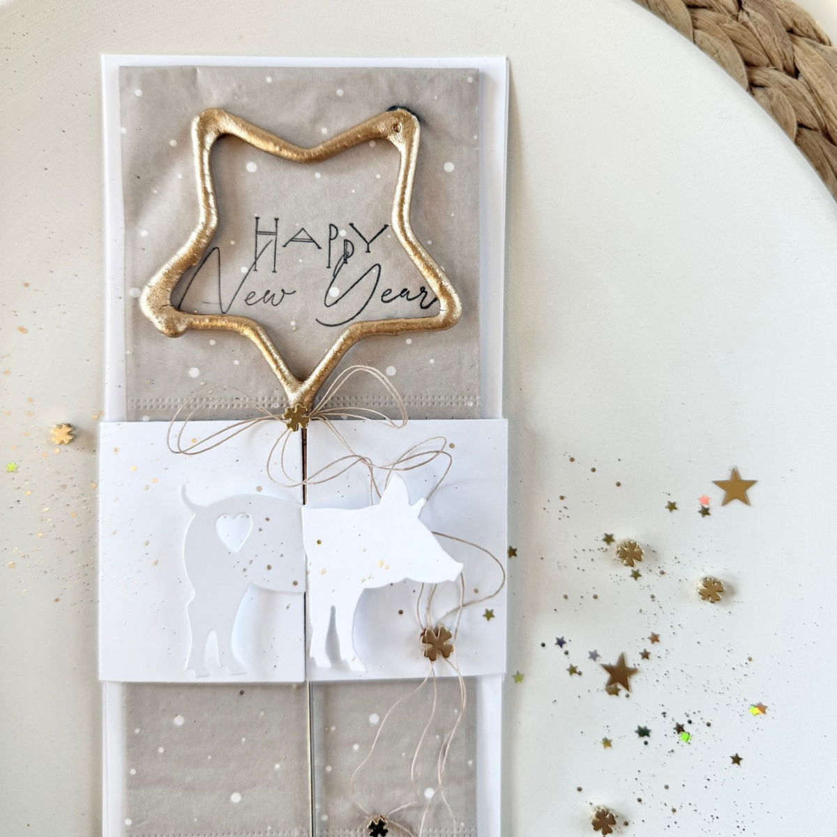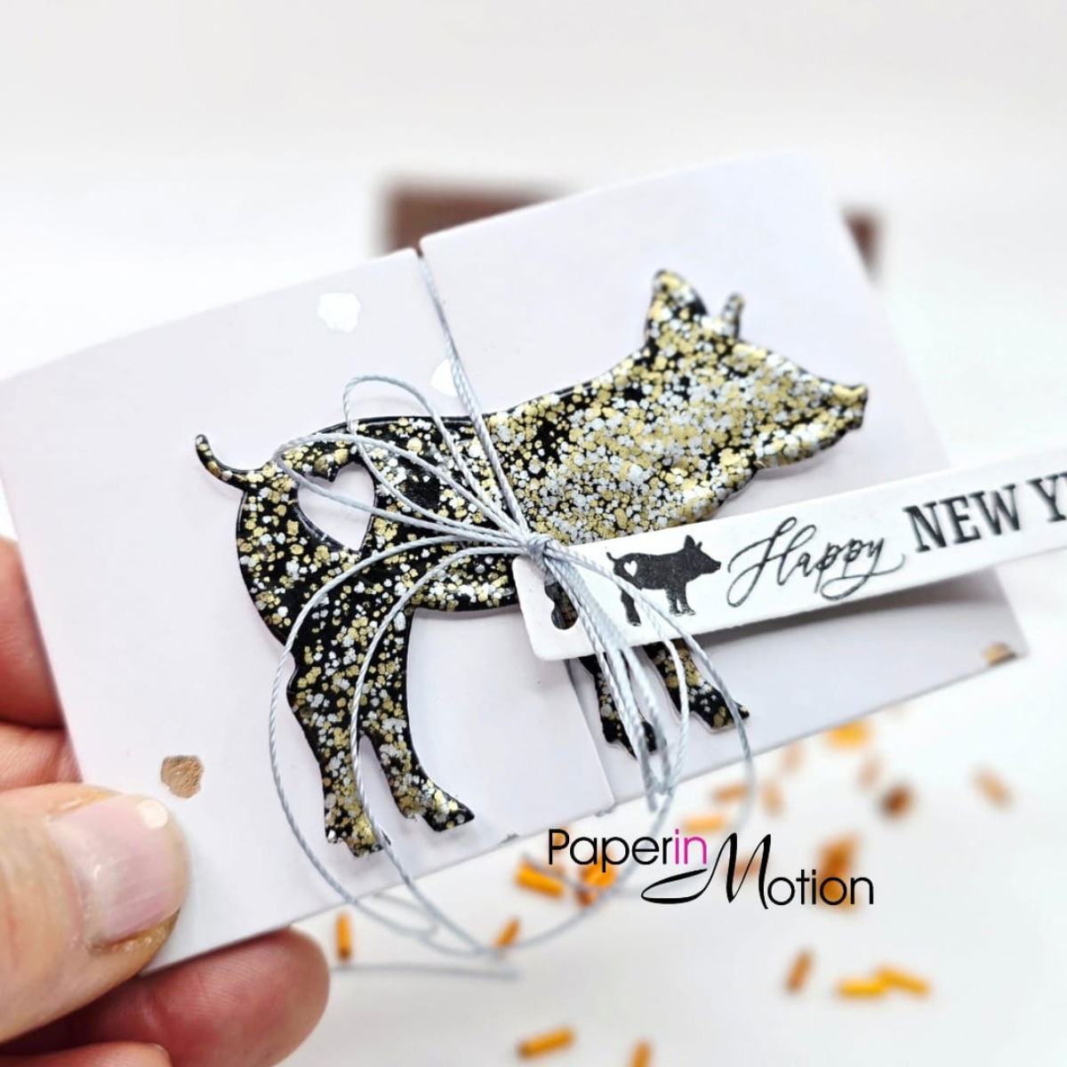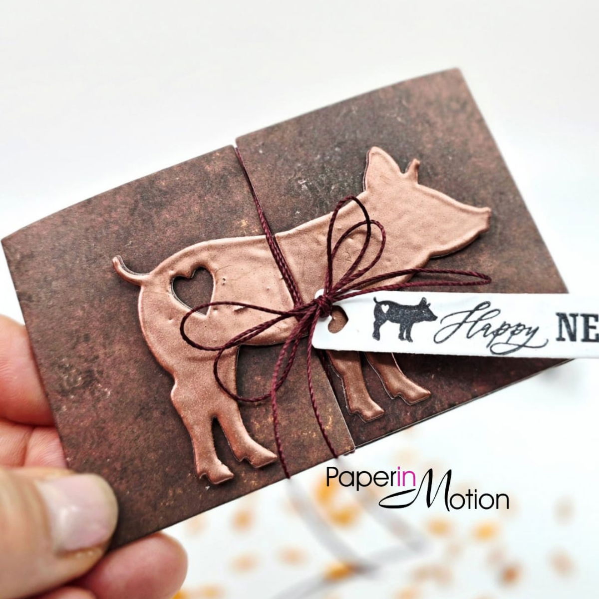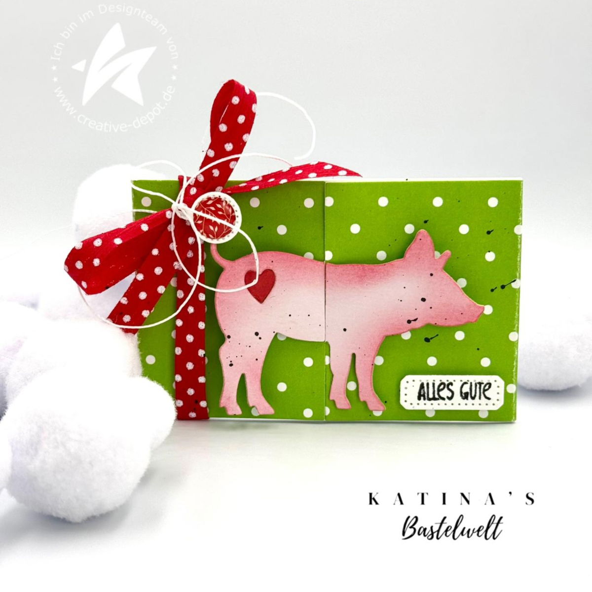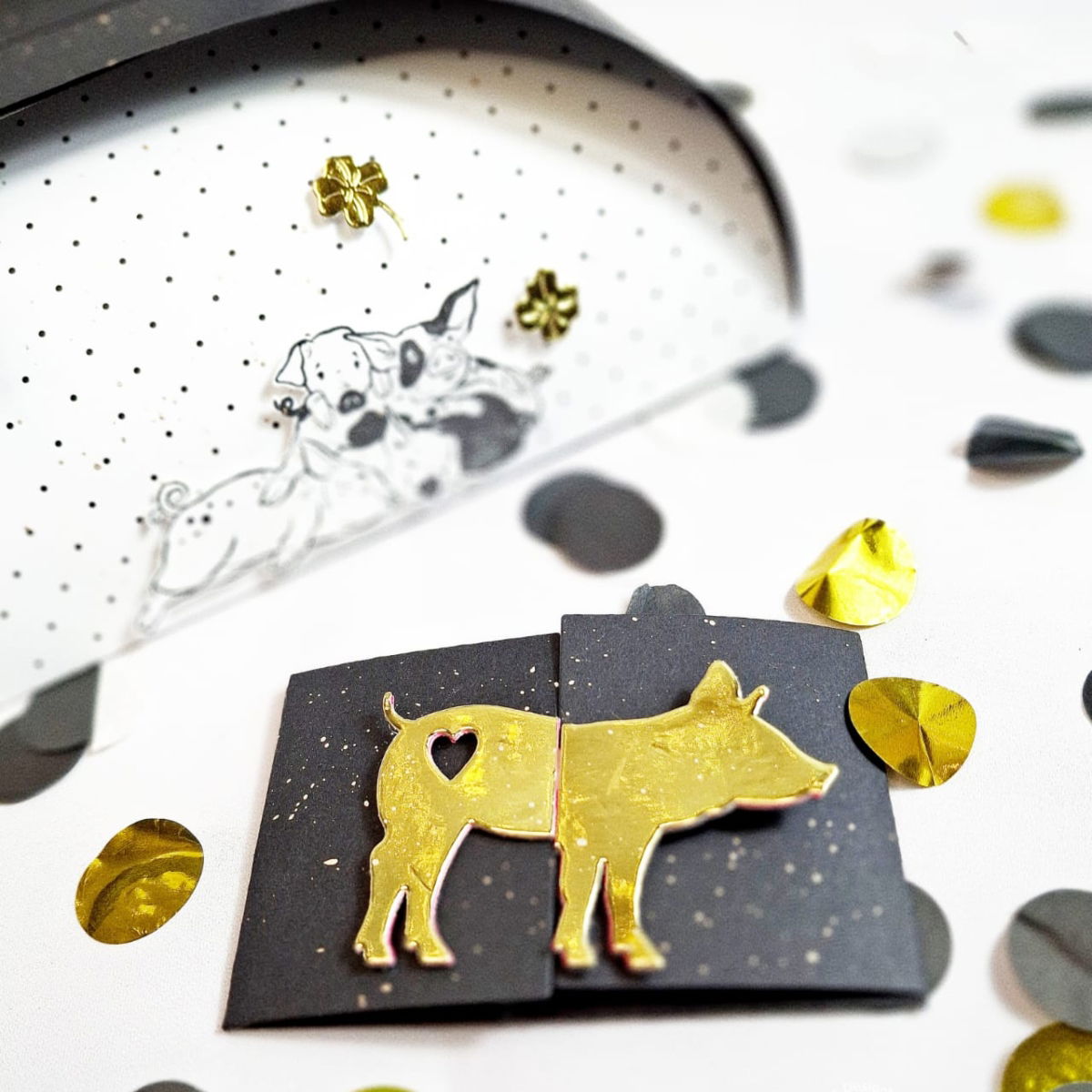 Die Stanze enthält alle Elemente, um eine kleine Klappkarte zu gestalten, aus der ein fröhliches Glücksschweinchen hervorblinzelt. Ein echter Hingucker – humorvoll, charmant und voller Herz.