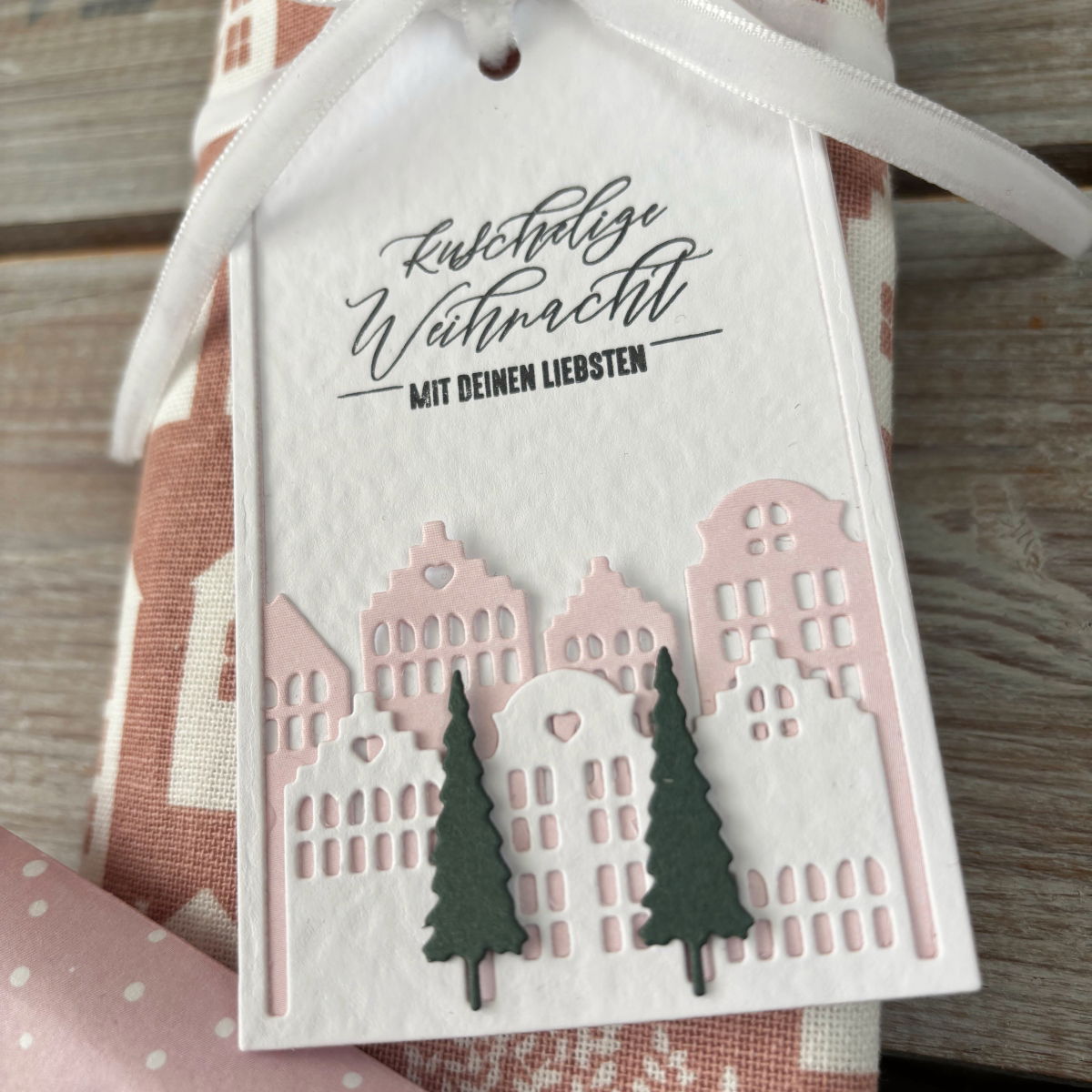 🏘️ Mit der Stanze „Layer Häuser für Standard Anhänger“ zauberst du im Handumdrehen wunderschöne, winterliche und städtische Motive auf deine Geschenkanhänger!