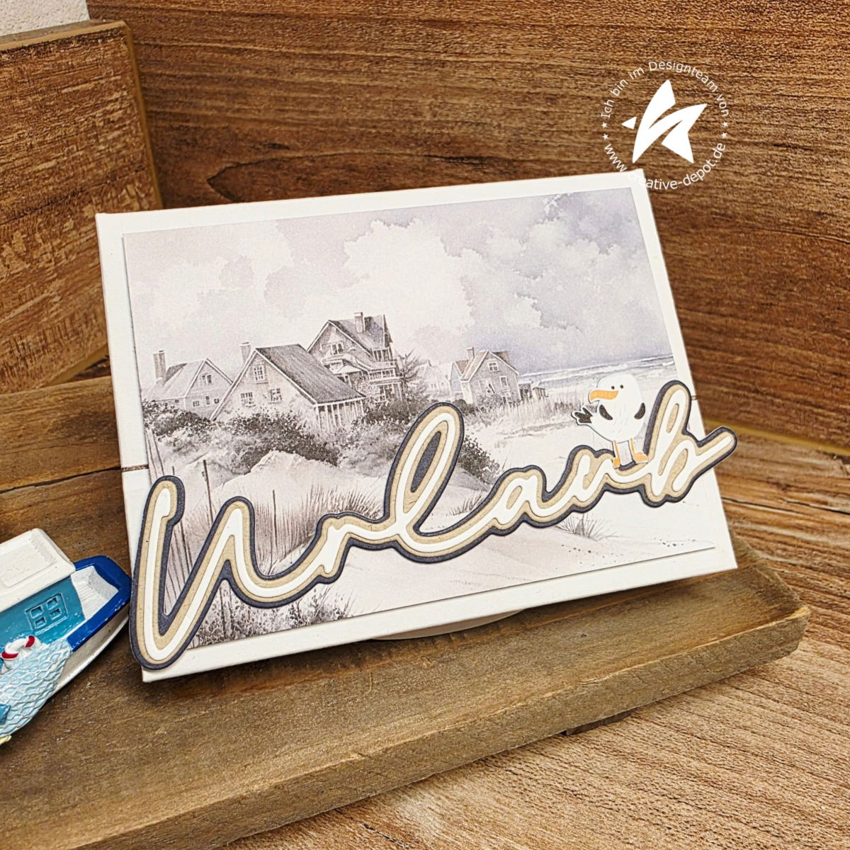 Der wunderschöne Schriftzug „Urlaub“ als Anhänger gehört zur Scrapliebe – Serie – Reise und lässt sich in drei Farblagen layern – für besonders farbenfrohe Ergebnisse.