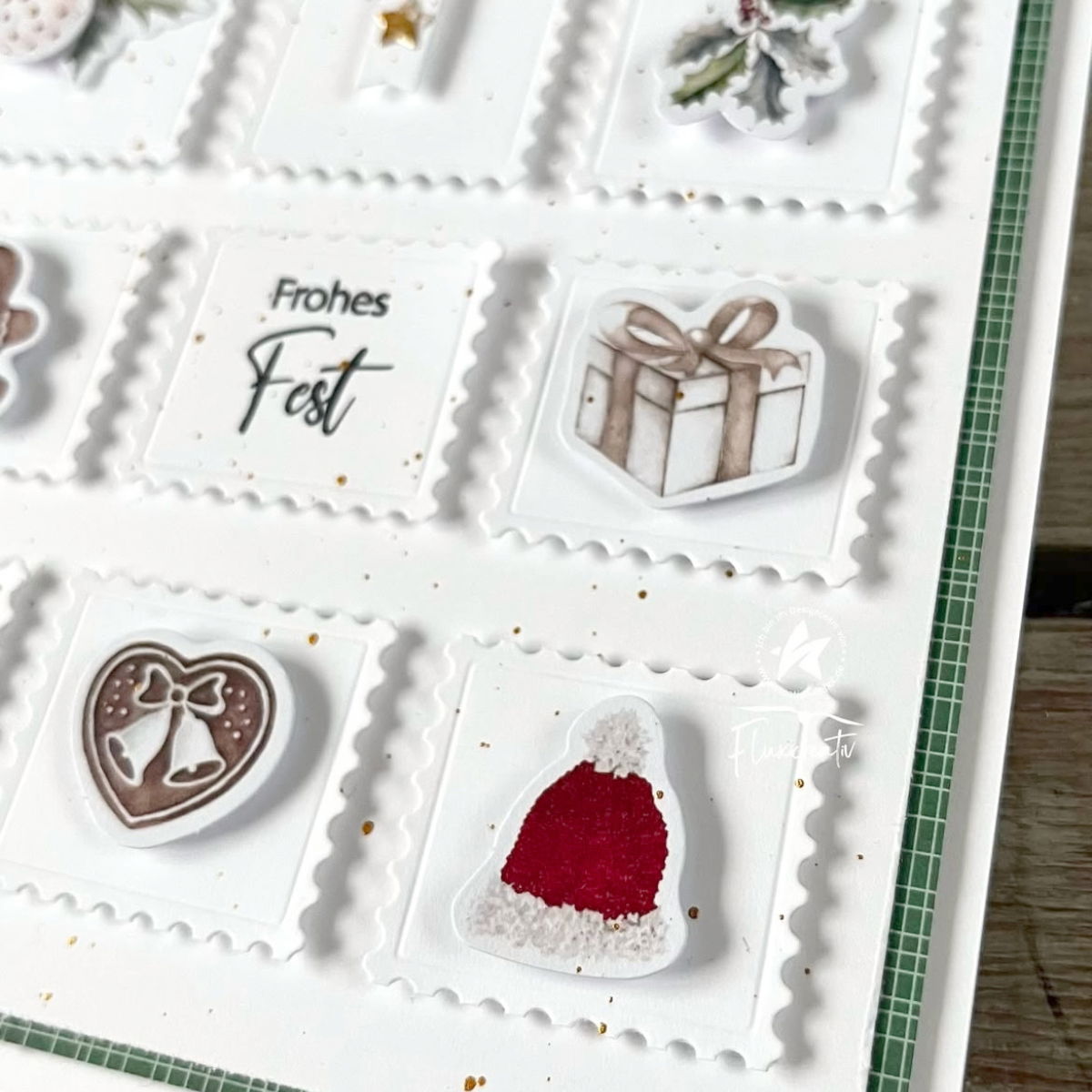 Zwei Streifen, mit denen ihr jeweils 5 Formen ausstanzen könnt, die einer Briefmarke ähneln. Mit dem einen Streifen könnt ihr einen Briefmarkenstreifen ausstanzen, der nur den gezackten Rand hat und der zweite Streifen hat noch mal einen geprägten Rand in jeder Briefmarke. Sie lassen sie perfekt mit dem Stempelset „Liebe Grüße aus....“ kombinieren.