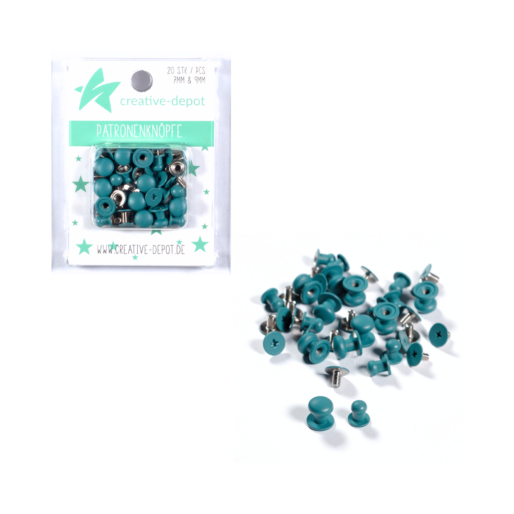 Patronenknopf - Pfauenblau - Matt - 20 Stück - 7 mm & 9 mm